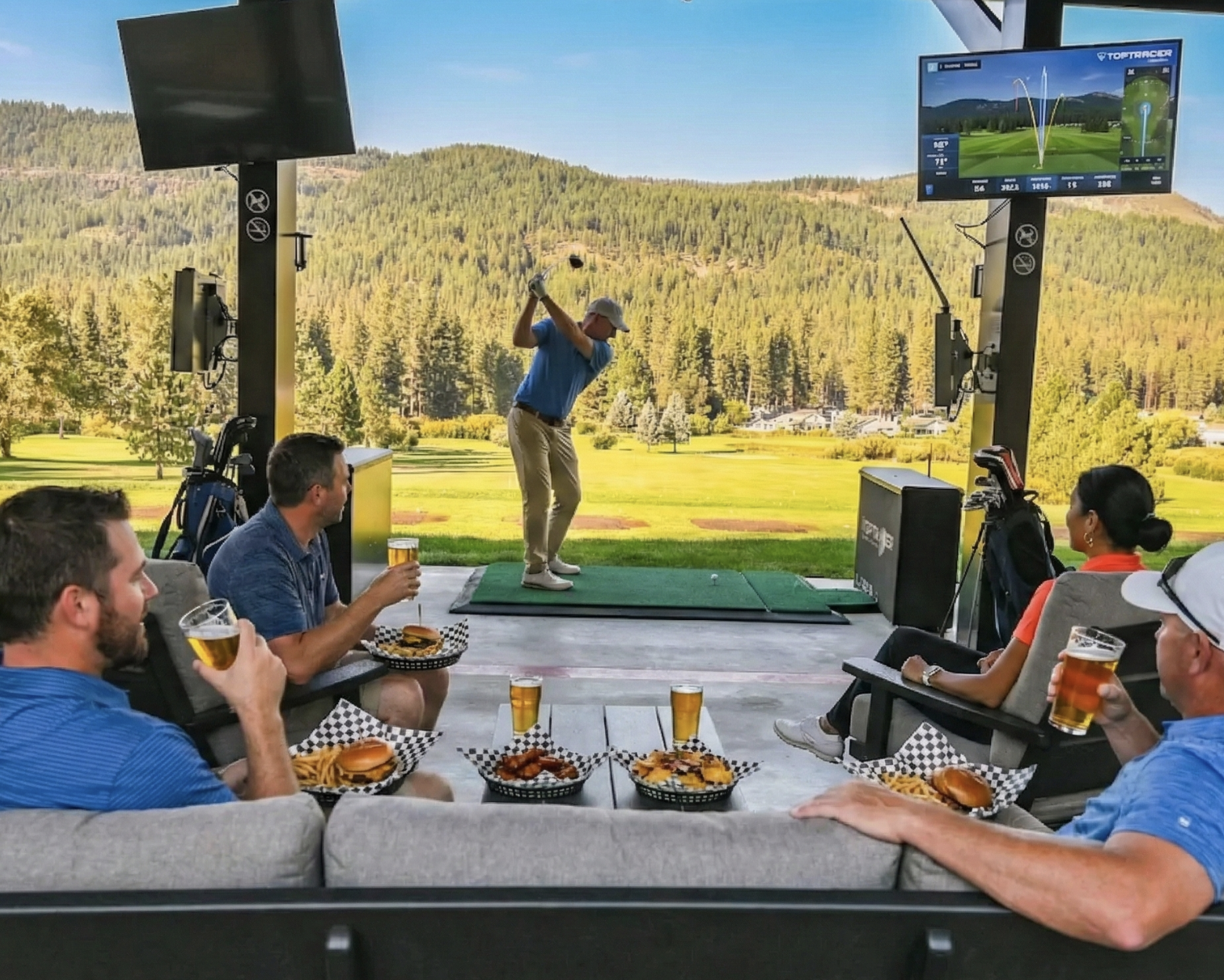 Experience the perfect golf trip with more than just 18 holes. Eat, drink, and lounge at a Toptracer range: Hot Shots. Hot Shots is the perfect spot to unwind with your group after a day on the course or a welcome party the night before. Choose between