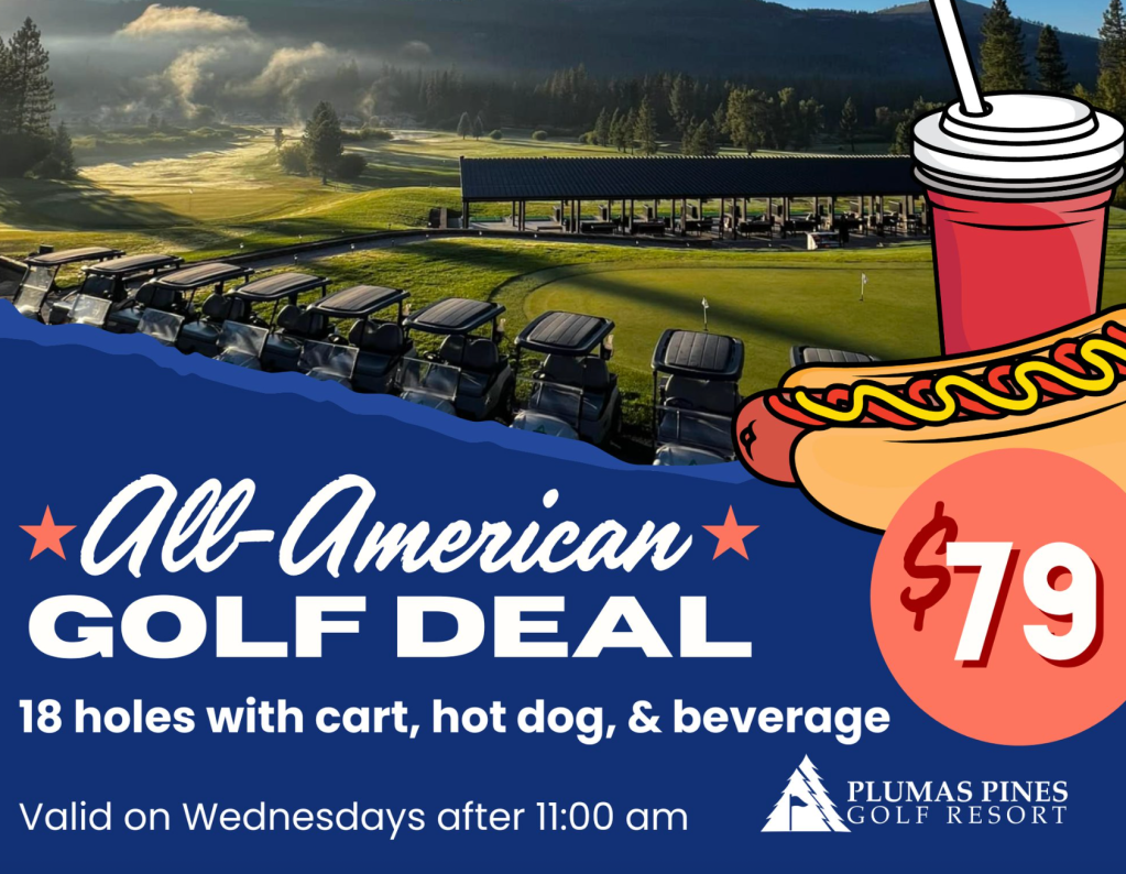 18 holes, cart, hot dog, fountain drink for $79. Every Wednesday!